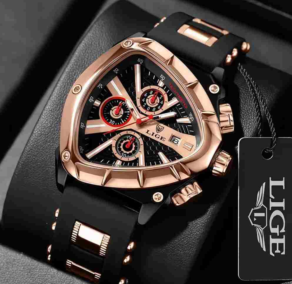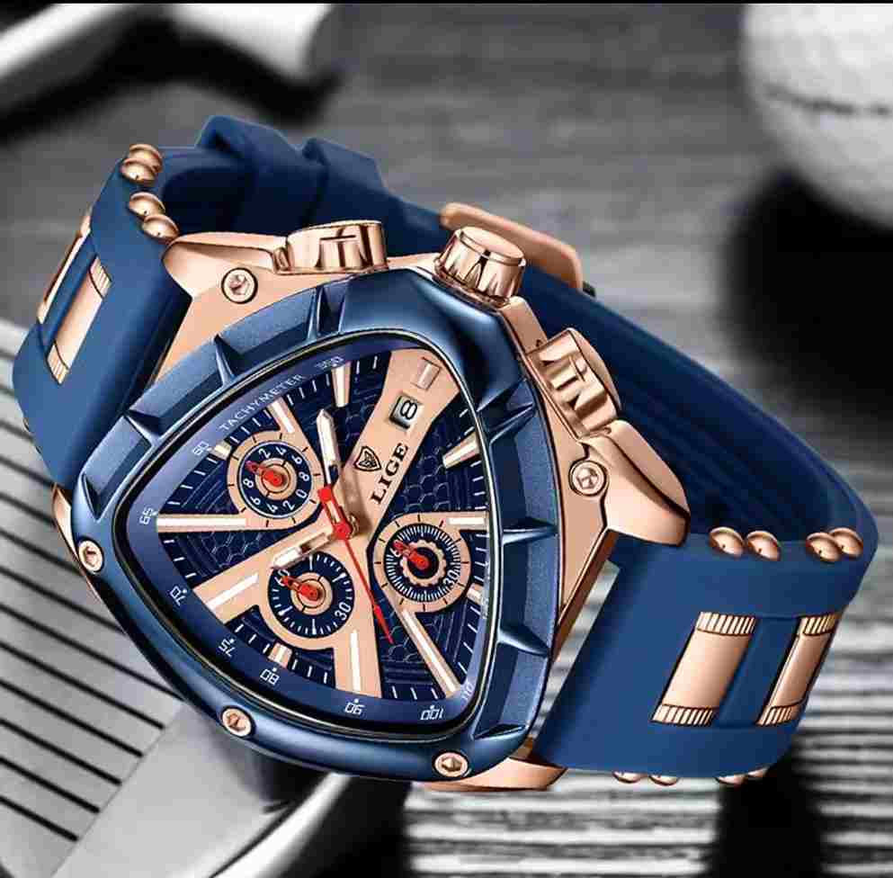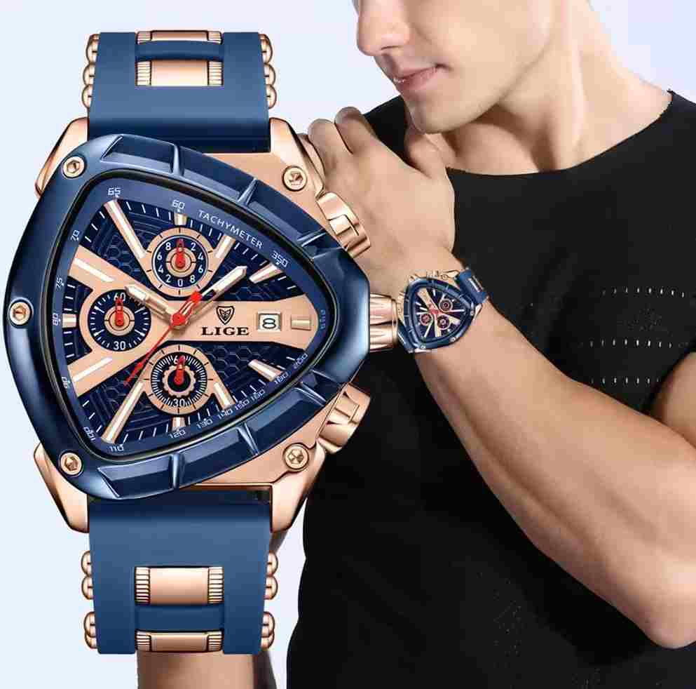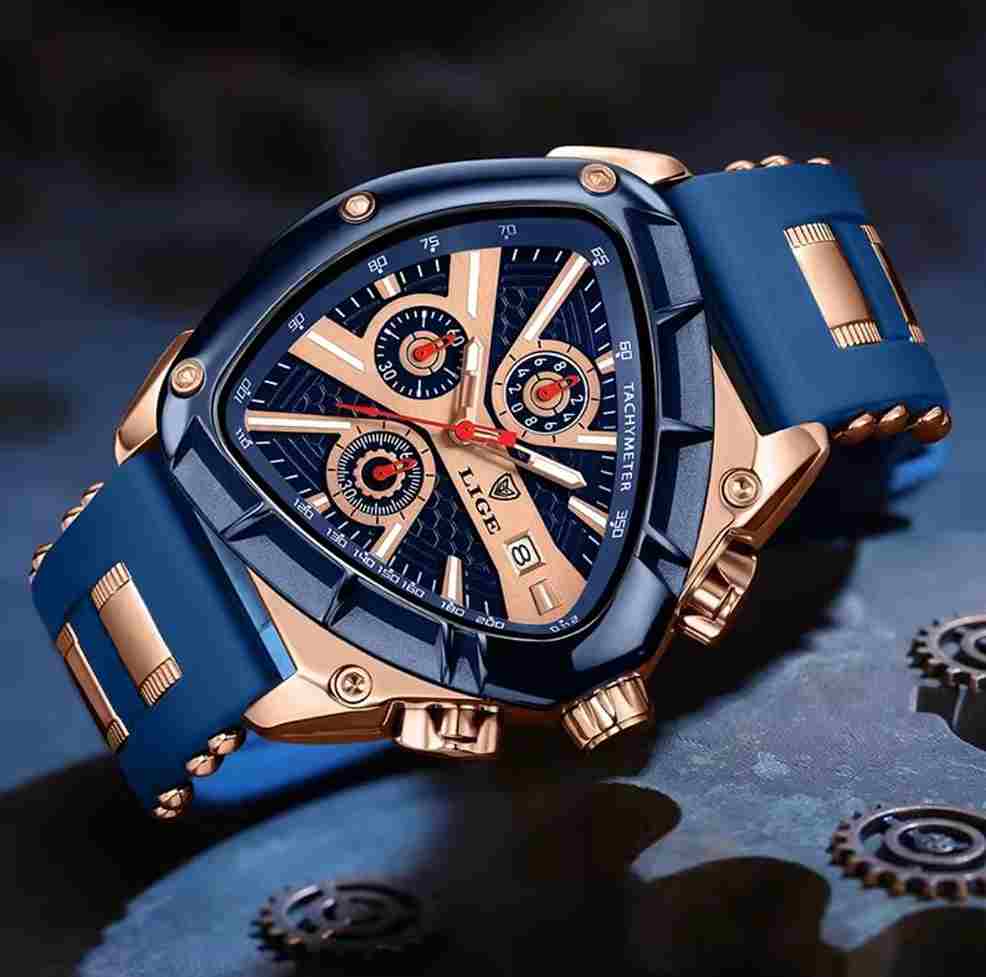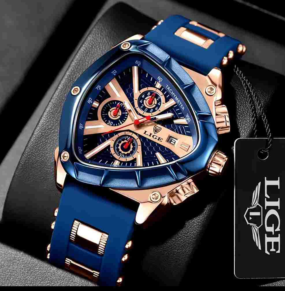 El reloj que refleja tu éxito. Con su diseño triangular exclusivo, combinación de negro o azul con dorado real, y maquinaria ultraprecisa. LIGE INVICTUS está hecho para hombres que dominan cada momento.
