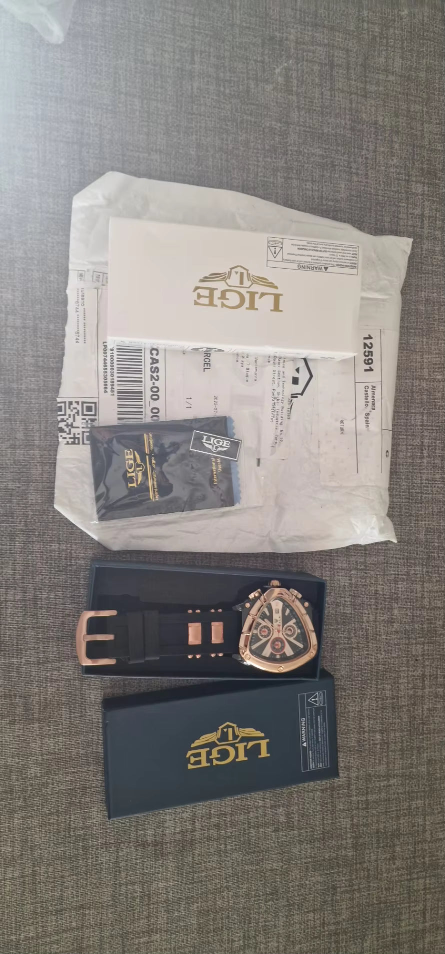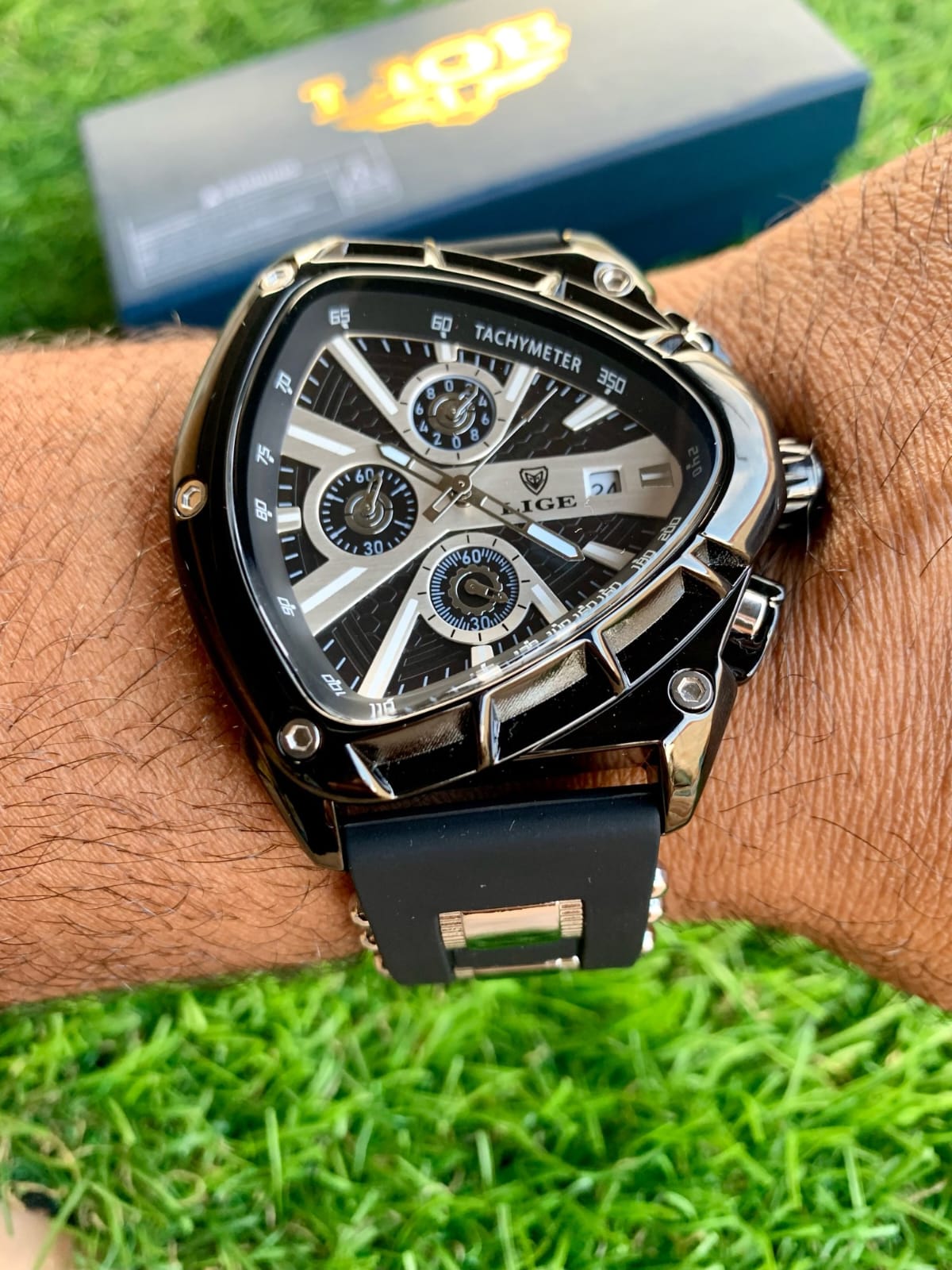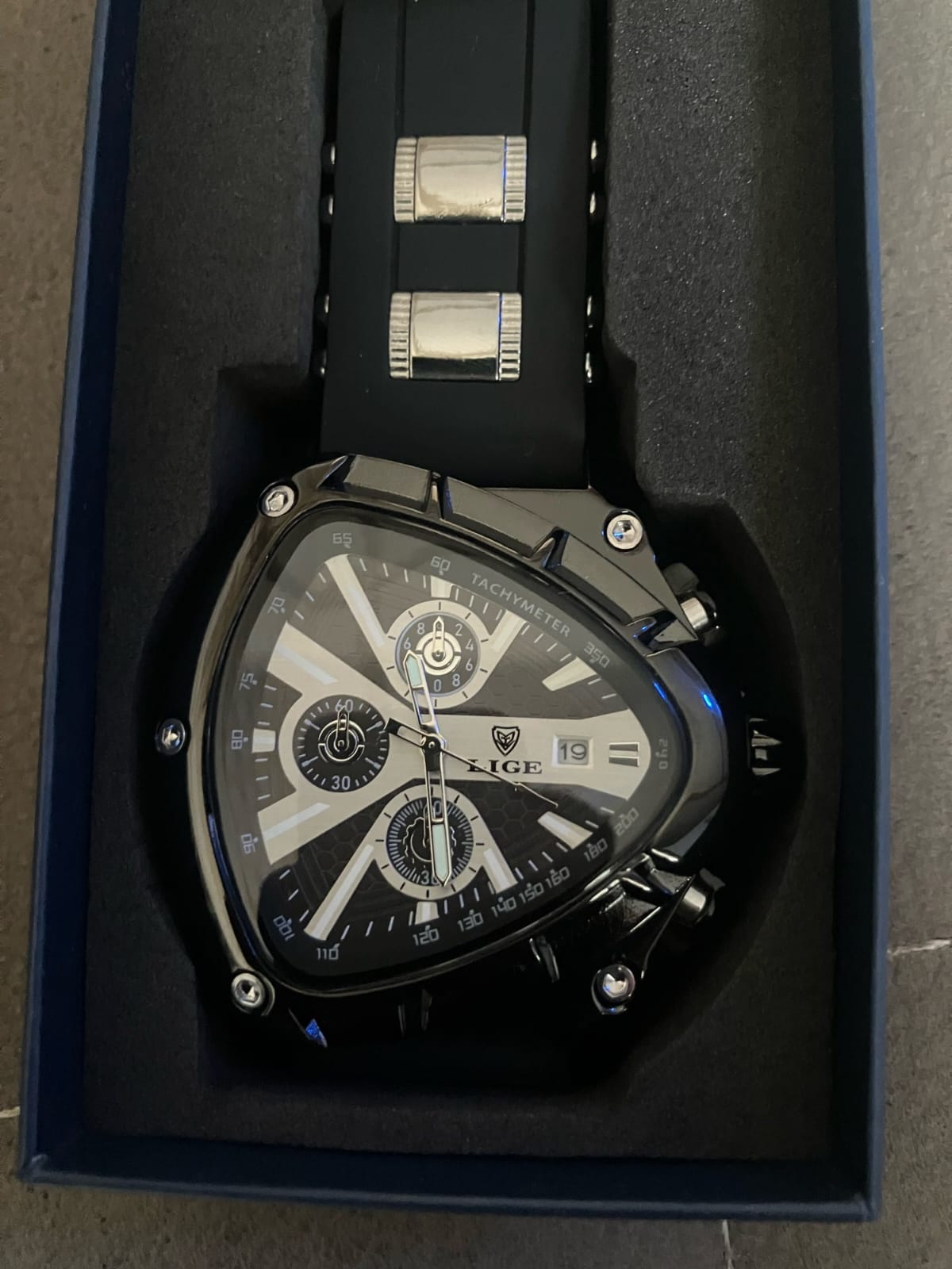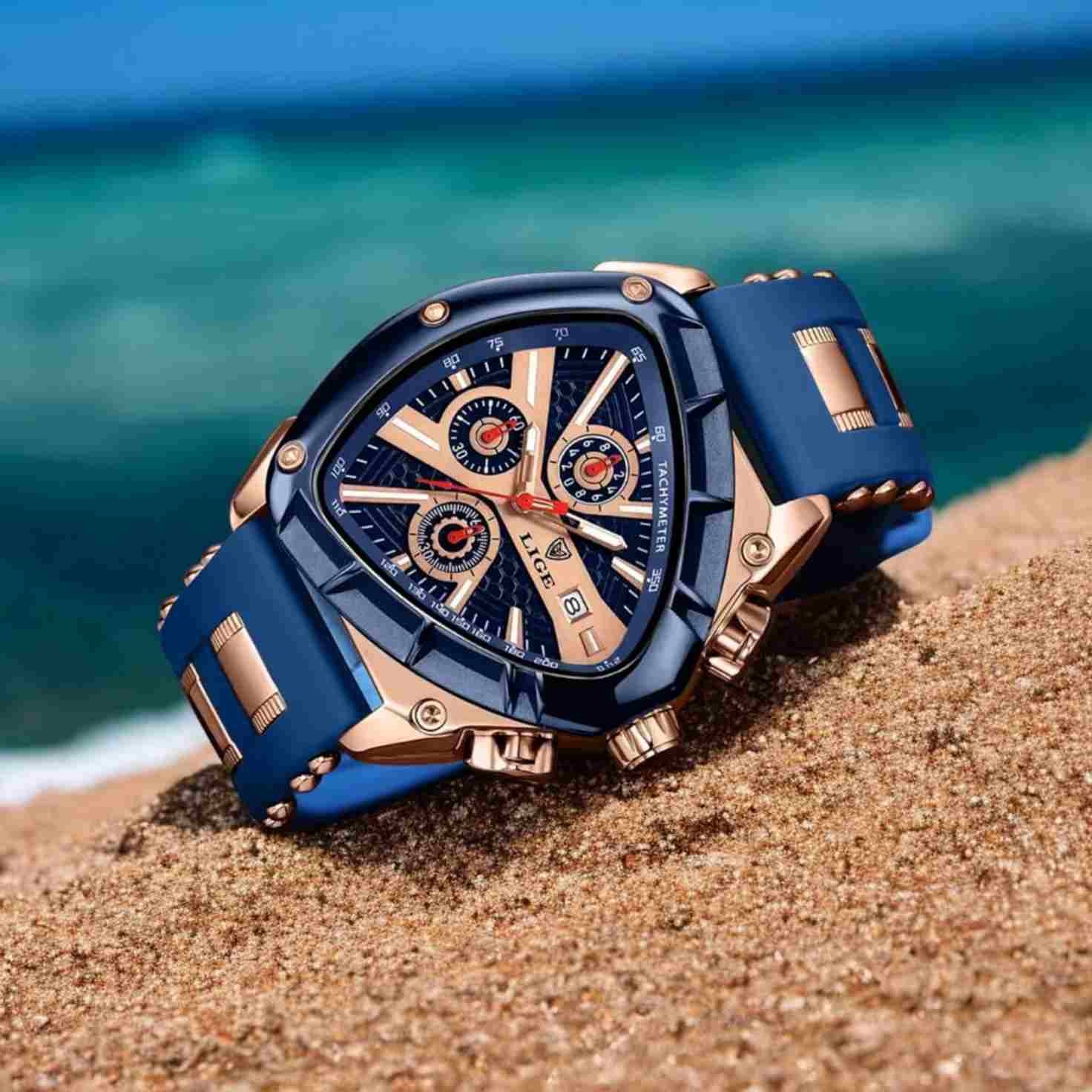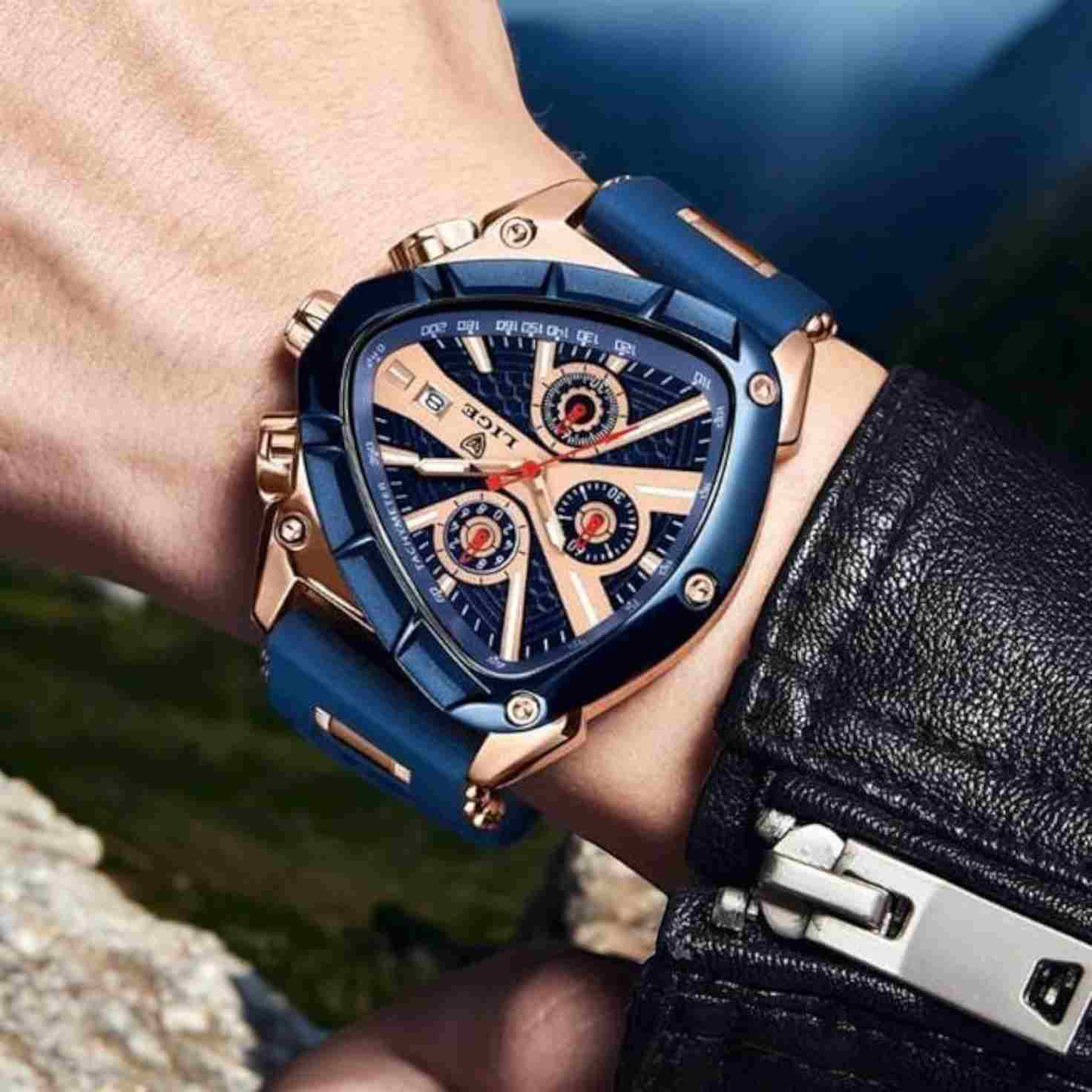 El reloj que refleja tu éxito. Con su diseño triangular exclusivo, combinación de negro o azul con dorado real, y maquinaria ultraprecisa. LIGE INVICTUS está hecho para hombres que dominan cada momento.